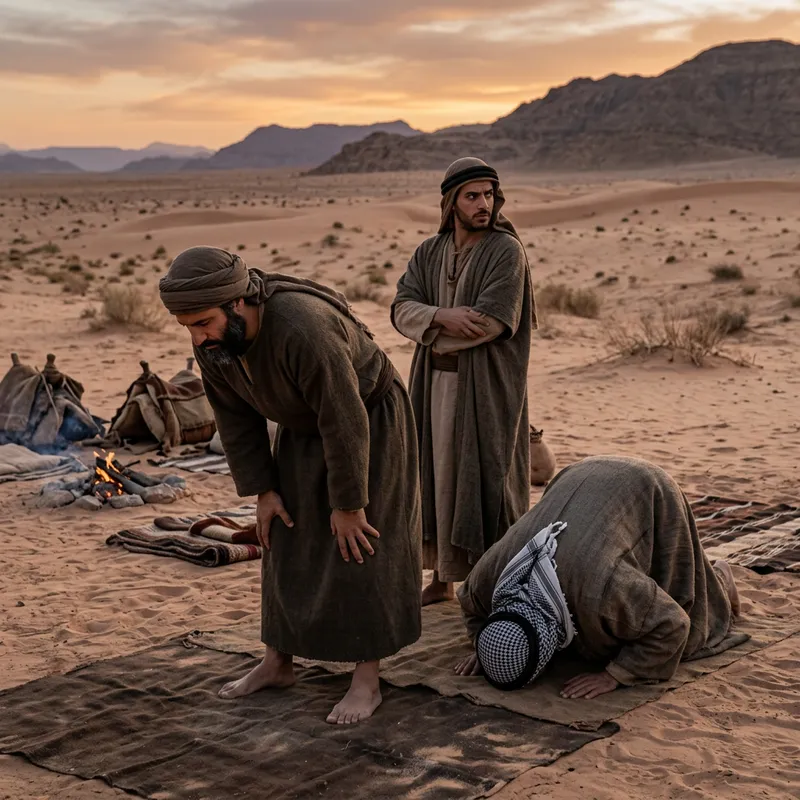 A Middle-Eastern man is praying with another two men praying behind him in a desert setting. This scene represents the pre-Islamic era. One of the two men behind him is in active prayer, while the other one is metaphorically challenging the leadership of the initial man.