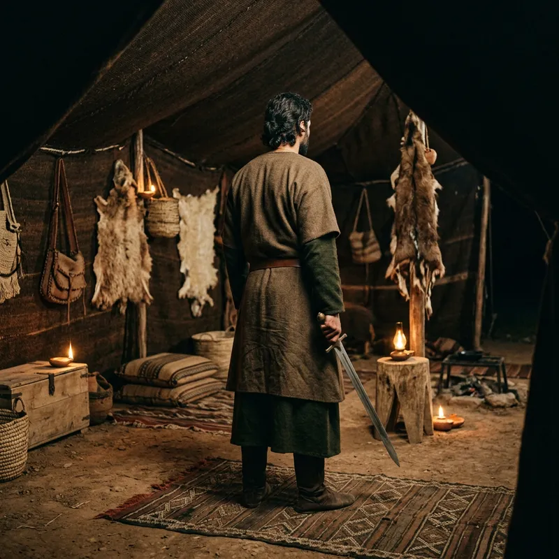 Middle-Eastern Man in Pre-Islamic Era Tent Holding Sword
