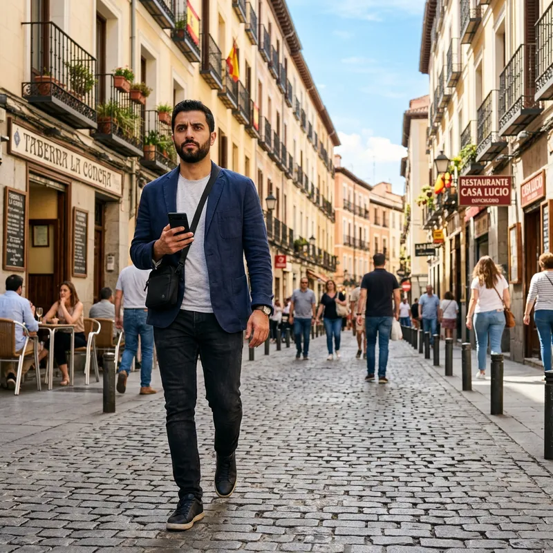 A Middle-Eastern man is walking down a cobblestone street in Madrid, Spain. He is looking straight ahead with a slight air of concentration on his face. In his right hand, he holds a contemporary cell phone. He is wearing casual city attire, under the sunny afternoon sky, with the bustling city and its charming buildings surrounding him.