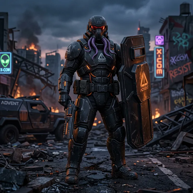 The Mind Flayer, without wings, wears the armor of an Advent soldier from X-COM 2, with a helmet on his head and a ballistic shield in his left hand. on the right is a revolver from X-COM 2