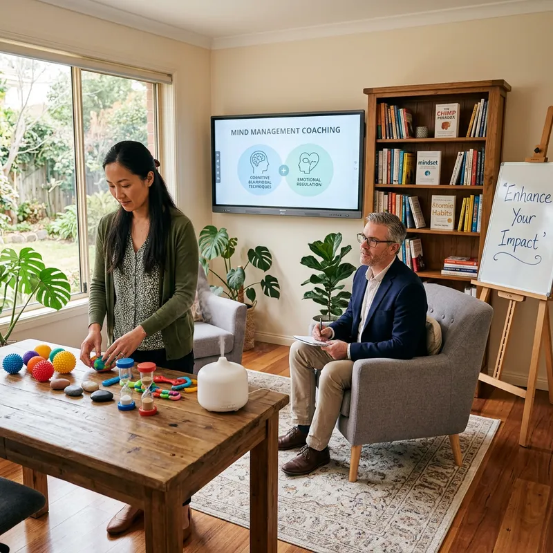Create an image of a calm and serene environment: a comfortable coaching room filled with various aspects of mind management coaching. In the room, show several books on mind management stacked neatly on a wooden shelf. An easel with a fluently written phrase 'Enhance Your Impact' stands in the corner. A professional Caucasian male coach is sitting attentively on a chair with an interactive digital screen behind him displaying 'mind management coaching' concepts. Nearby, for psycho-sensory therapy, an aroma diffuser quietly releases aromatic mist, and a collection of colourful sensory therapy tools is displayed on a table. An Asian female therapist is found adjusting the therapy tools. Both professionals appear intent on assisting individuals to unlock their potential and manage their thoughts effectively.