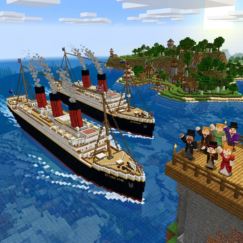 Minecraft. Victorian. Ocean liners at sea. Island minecraft players in background waving.