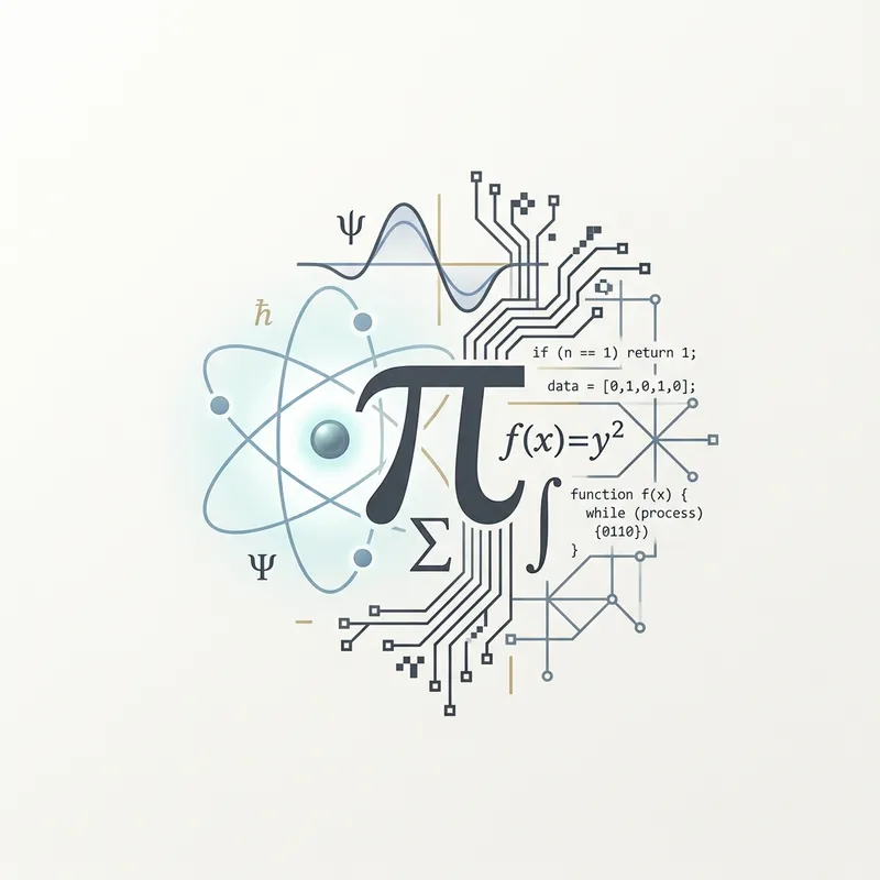 An image adhering to the aesthetics of minimalism, representing the fields of science majorly concentrating on mathematics, physics, and Information Technology. The image can possibly feature symbolic representations of these subjects. For instance, mathematical symbols, quantum physics icons or holograms, and IT elements like code snippets or pixelated circuit boards. The colors should be understated and simplistic, and the overall design should convey the essence of these subjects intertwined in a simplistic and elegant fashion.