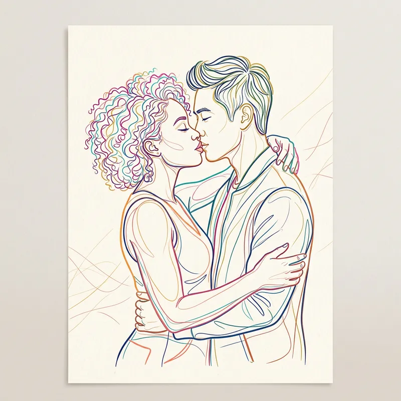 A minimalist line art style scene of an Asian man and a Black woman sharing a kiss. The image should exhibit delicate, thoughtful strokes of vibrant and tasteful colors. Despite the abundance of colors, the image remains classy and not tacky. The primary use of color should carefully trace the outlines and contours, outlining the figures in an elegant and understated manner.
