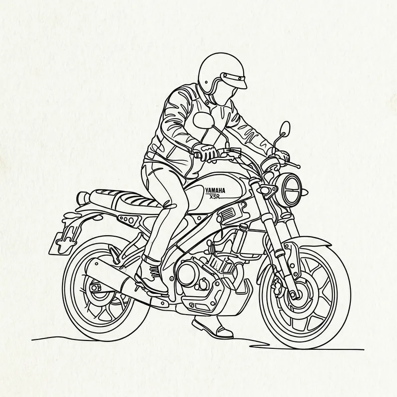 An illustration depicting a biker in a minimalist, single line art style. The biker is mounting on a Yamaha XSR motorcycle. The biker is wearing a classic biker attire, consisting of a leather jacket and a helmet. The Yamaha XSR, revered for its retro styling and powerful performance, is accurately represented, capturing its round LED lights, teardrop-shaped fuel tank, and sporty profile.