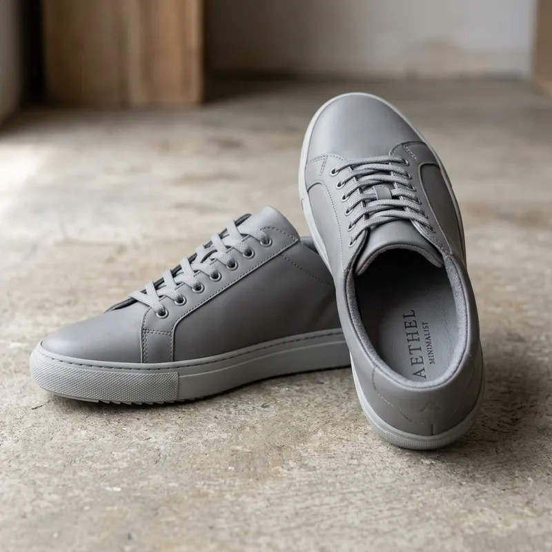 A pair of minimalist design shoes. They have a streamlined, clean aesthetic with a focus on simple forms and functionality. The color palette is neutral, with a mixture of greyscale tones. They are made of quality leather with a comfortable insole and a durably designed outsole for extended wear. Each shoe has subtle detailing, including neatly aligned eyelets for the shoelaces, and a soft fabric lining inside to ensure comfort for the wearer. The shoes exude an understated elegance, embodying minimalism in both design and function.