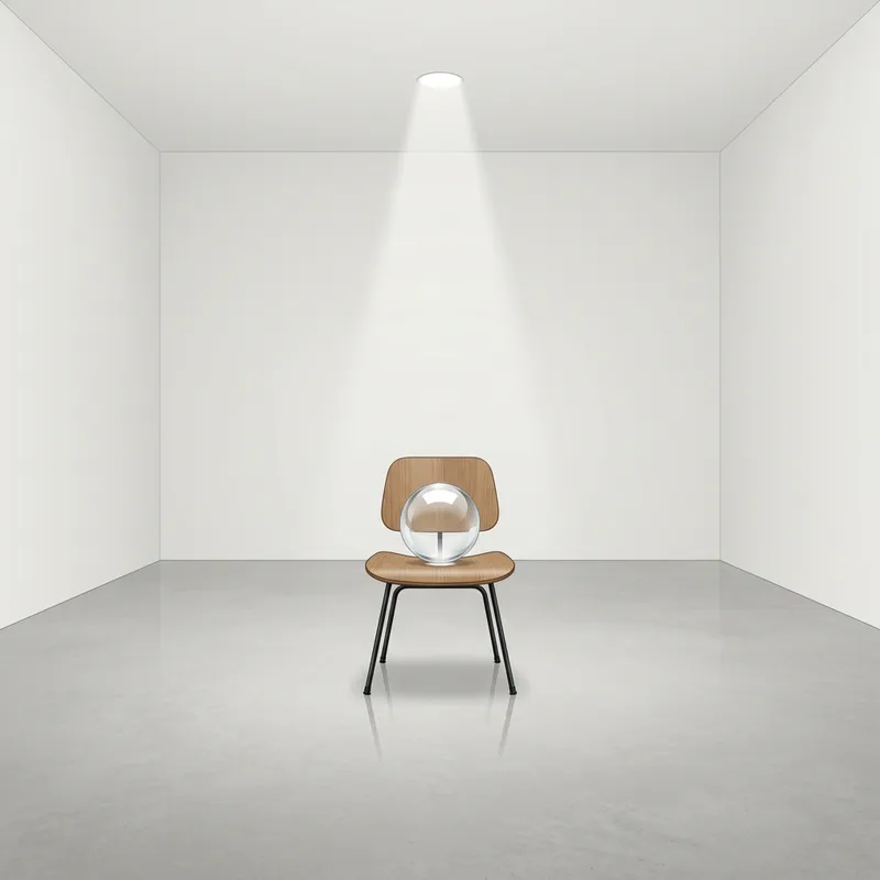 Display an illustration that interprets the abstract concept of 'Integrity' set in a minimalist style. Depict an empty room with a single chair in the middle. On the chair, place a crystal-clear glass ball reflecting the white light falling from a single source in the ceiling. The room's surroundings should be devoid of any objects or distractions, symbolizing simplicity and minimalism. The crystal globe on the chair embodies Integrity, being unbending and transparent.