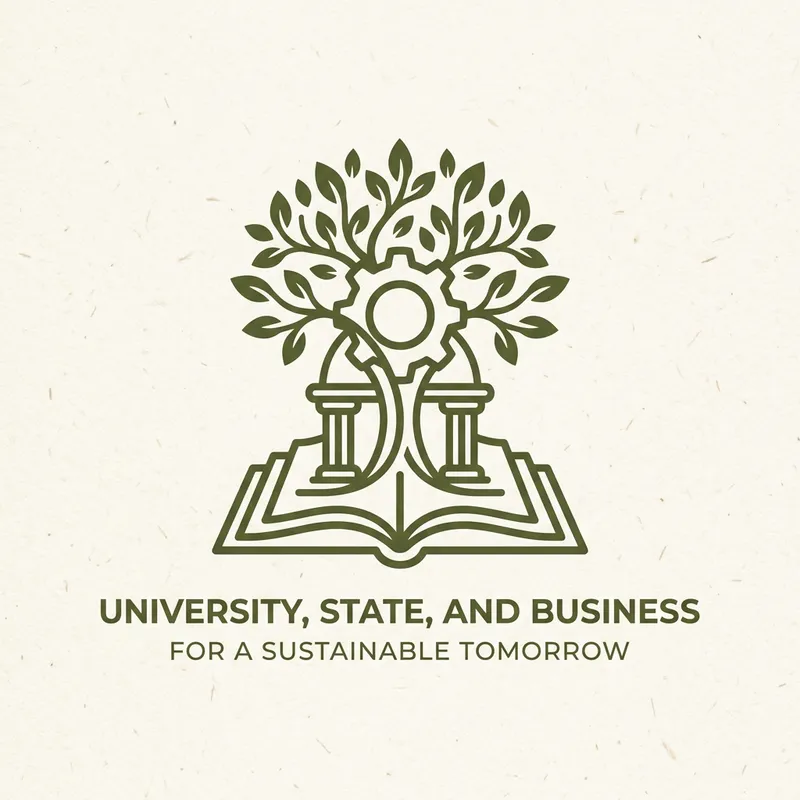 Design a minimalist logo for an event titled 'University, State, and Business for a Sustainable Tomorrow'. The logo should incorporate symbols that represent education, governance, industry, and sustainability, for instance, an open book for education, a government building for the state, a gear for business and a tree or a leaf for sustainability, amalgamated into a harmonious whole. The color palette should be earthy and subdued, invoking sentiments of environmental consciousness.