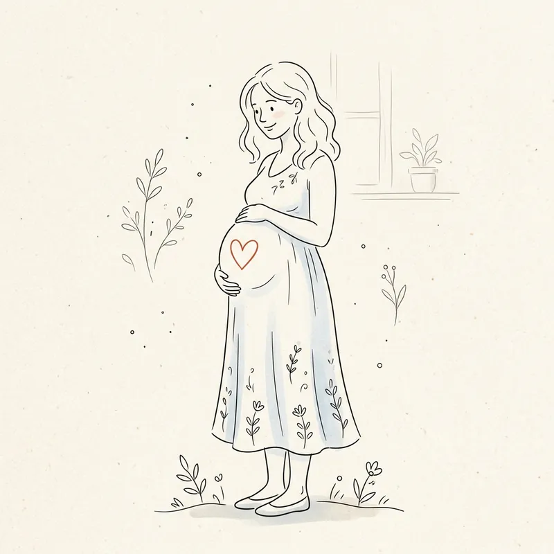 A pregnant woman simply drawn with fine lines, with a heart symbol located on her belly, in a simplified art style.