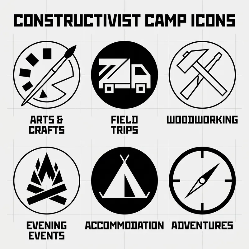 Design a collection of minimalist round website menu icons reflecting the stark and streamlined aesthetics of Russian Constructivism. Maintaining a neutral black and white color palette, these vector graphics icons should use uncomplicated geometric shapes and lines to represent various elements of a children's camp - such as a paint palette, a transportation truck, a carpenter's hammer, and more. This icon set would be ideal for a contemporary and chic website design.