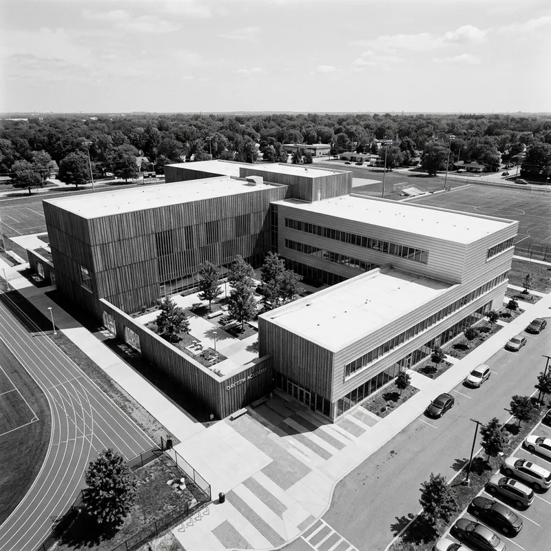 An aerial perspective of a minimalist school building, featuring a stark contrast between gray vertical wooden facades and sleek horizontal metal facades. The image is a black and white photograph and emphasizes clean lines and strong contrast, capturing the essence of the architectural structure. The sharpness and distinctness of the image is akin to what could be captured with a 50mm lens.