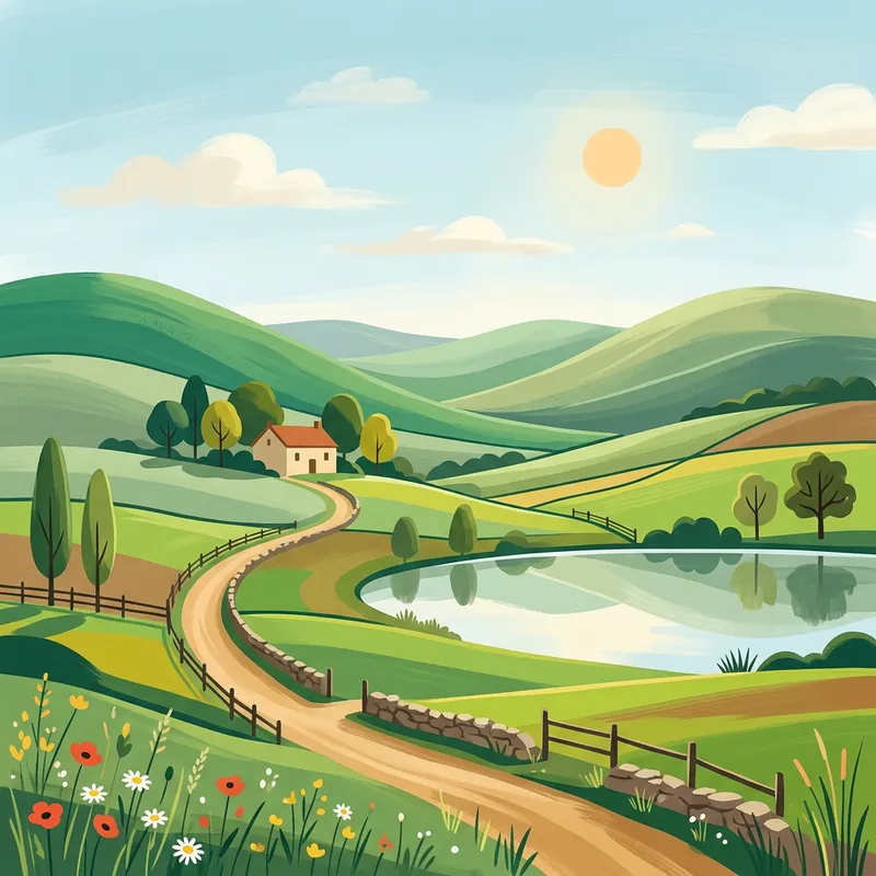 Digital painting of a serene countryside scene portrayed in a minimalist style. Picture clean lines and vibrant colors that breathes life into the environment. The landscape consists of gently rolling hills reflected with a gentle brushwork, all inspired by the splendor of nature.