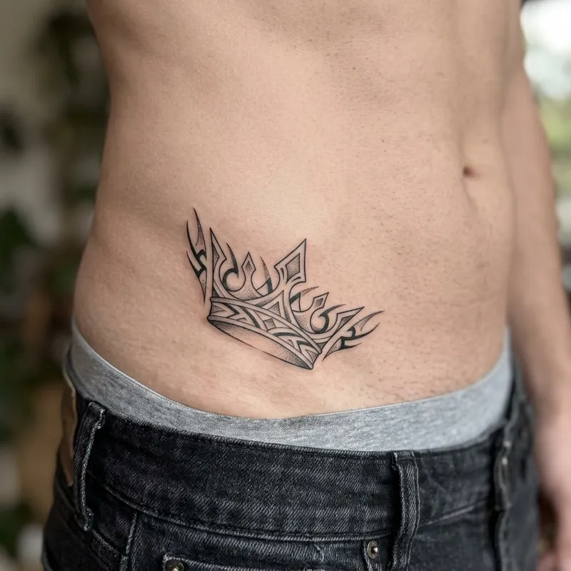 Create an image of a minimalist tribal-art inspired tattoo design with a delicate motif of a king's crown. This tattoo should be displayed on the hip bone area of a Caucasian man. The tattoo will be done with black ink using fine needles, with precise shading to enhance depth. The size should be smaller and placed lower, closer to the pubic bone, giving an intimate appeal. Highlight the intricacy and precision of the black line work that emphasizes the tribal style. The final result should demonstrate a personal, meaningful tattoo, radiating elegance and simplicity.