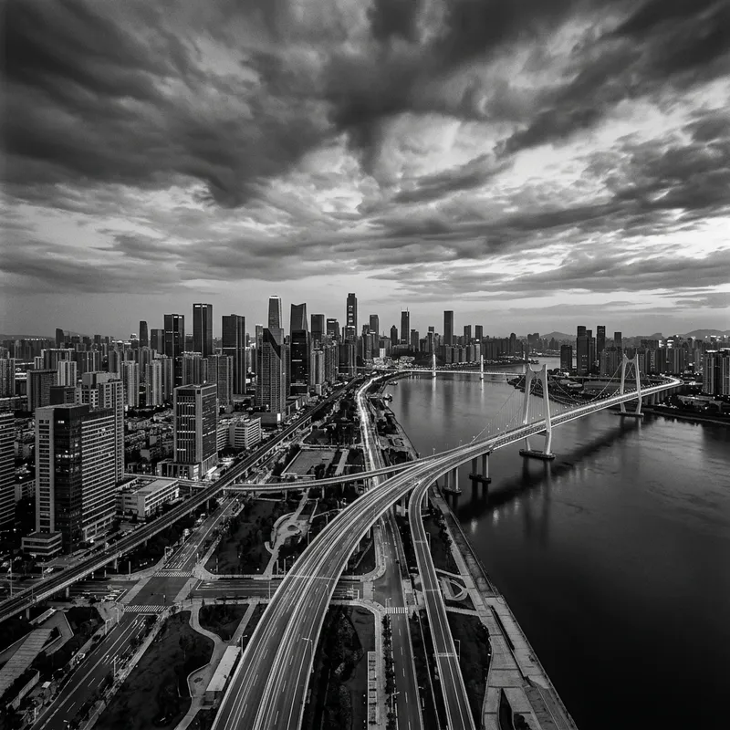 Picture this: a modern cityscape unfolds before your eyes. The city sets a striking silhouette against a dramatic sky, tall buildings reaching upwards with their intricate geometry. Panoramic views capture the urban heart with a minimalist approach - sleek lines, streamlined designs, and a judicious use of colors. Every corner of the city maintains an aesthetic of simplicity. This bustling cityscape is transformed into a monochrome world, where the city's intricate network of roads and bridges are highlighted and emphasized. Yet, amidst this tranquil wilderness of concrete and glass, there exists a sense of serenity, a testament to the beauty of minimalistic design.