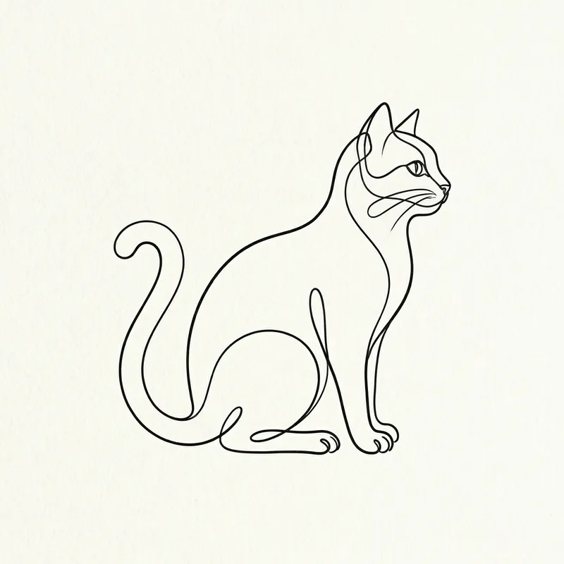Create a minimalistic illustration representing a feline using a continuous, unbroken black line.