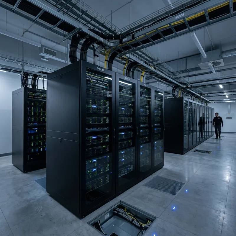 A series of Linux servers arranged in a sleek, uncluttered manner embodying a minimalistic design. The servers are located in a clean and spacious data center, glowing with activity lights blinking in a mesmerizing rhythm. The room exudes a cool ambiance with neatly organized cables and machinery. The color scheme is dominated by tones of black, white and shades of gray, further reinforcing the minimalist aesthetic.