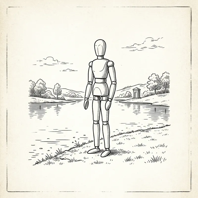 Create a high-quality, monochromatic pen-drawing reminiscent of retro-engraving designs. This artwork should solely utilize black lines on a white background without the addition of shadows, adhering to a laconic minimalistic style. The main subject of the illustration should be a mannequin, standing by a body of water, giving an impression of tranquillity and simplicity. The mannequin is not articulated or wearing any clothes, it's essentially a simple statue. All these elements should be blended harmoniously in the composition, capturing the essence of minimalistic, yet meaningful art.