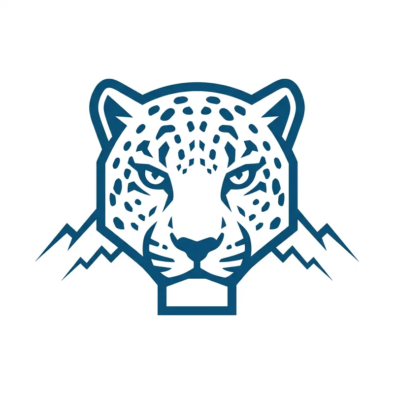 Design a minimalistic logo featuring a snow leopard's head. The primary color that should be used is blue, which encapsulates the snow leopard's natural habitat. The logo should simplify the snow leopard's features, focusing on its strong, square jaw, marvellous dotted fur and fierce eyes. It may also include the subtle suggestion of a snowy mountain range in the backdrop as a nod to the snow leopard's habitat. Despite its simplicity, the logo should convey a sense of stability, strength, and intrigue, characteristics associated with the creature.