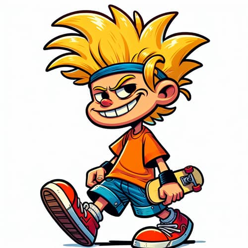 Playful Cartoon Character with Spiky Yellow Hair on Skateboard