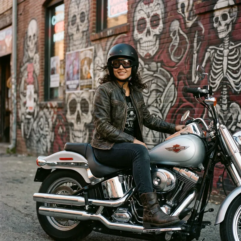 An attractive woman of mixed South Asian and Hispanic descent, casually seated on a Harley Davidson motorcycle. She wears a dark leather jacket and a helmet with safety goggles, her hair swept back in the breeze. The motorcycle gleams with a polished silver finish. In the background, abstract images of skulls and skeleton motifs, suggesting a rebellious, edgy vibe to the setting.