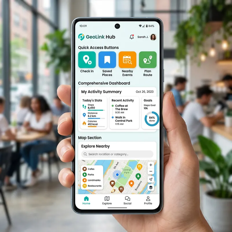 Mobile Application Interface Design with Quick Access Buttons, Dashboard, and Map Section
