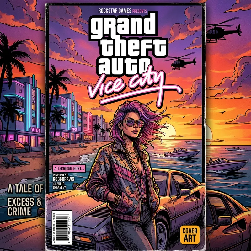 Vibrant GTA Vice City Cover Art in Borderlands Style