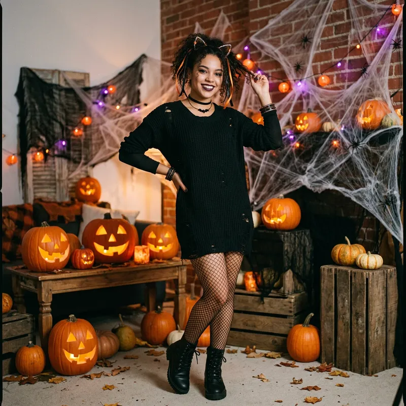 model wearing (naughty halloween) (sexy halloween costume) (fishnet bodystockings) (halloween outfit), spooky outfit posing for photo, background is halloween pumpkins and spiderwebs.