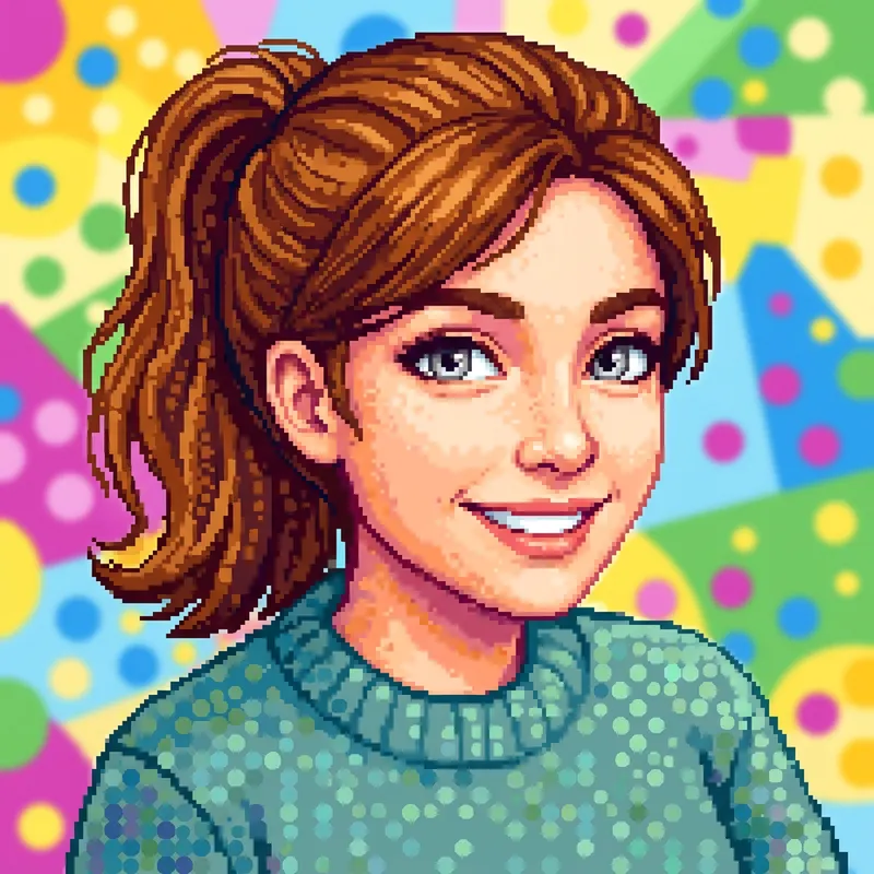 model with brown hair and silver eyes, wearing simple attire, tied ponytail and smiling, in a whimsical dot art style with vibrant colors, close-up portrait, digital painting with pixel art influences, playful mood, c-cup