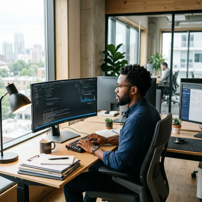 An Afro-American man working in front of a computer, his eyes focused on the screen as he skillfully types on the keyboard. He is seated comfortably in an ergonomic chair at his desk, surrounded by office essentials such as a desk lamp, a stack of documents, and a cup of coffee. The office environment around him is modern and minimalistic, with sleek design elements and abundant natural light pouring in through a nearby window.