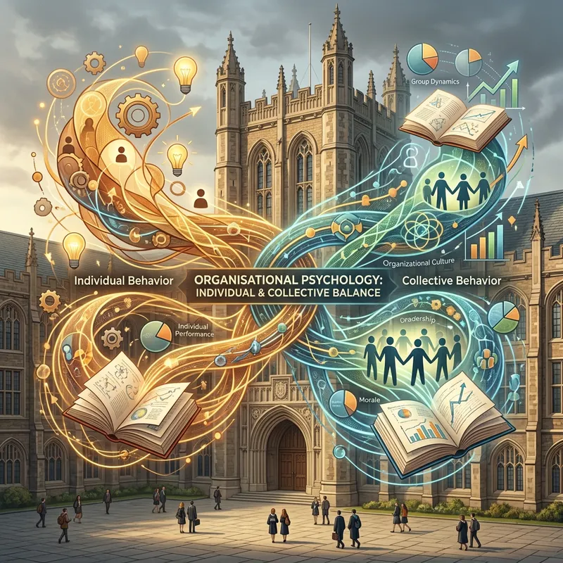 Visual interpretation of Organisational Psychology as presented in a reputable university. Emphasize the balance between individual and collective behaviors in organizations. Blend the subject's theoretical aspect with abstract shapes and colors. Feature the open books, charts, or graphs to represent academics. Ensure the elements are entangled amidst a backdrop of a detailed and towering university building reminiscent of early 20th-century architecture.