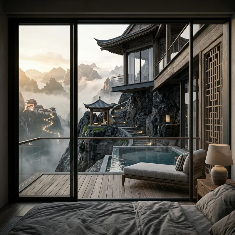 3D depiction of a view out your window from your bedroom looking over your modern balcony with a pool perched atop a mystical mountain peak with a stunning view. The architecture should blend seamlessly with the natural rock formations, with intricate pathways and meditation spots carved into the stone. Incorporate elements of Eastern and Western architectural styles, creating a harmonious fusion of cultures. --ar 9:16 --style raw --stylize 250 --v 6