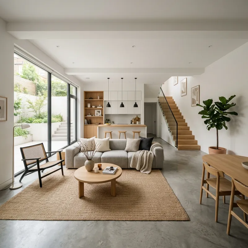 modern basement lounge with sleek furnishings, styled after minimalistic Scandinavian design, featuring neutral tones and natural light accents, showcasing an open layout, wide-angle photography.