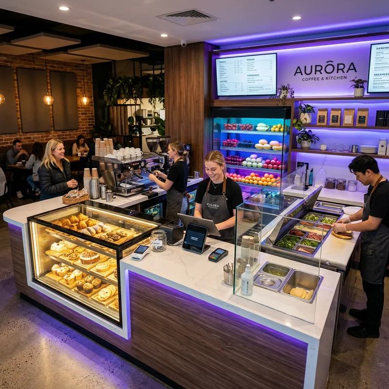 Modern cafe counter with beautiful pastry display case refrigerator, illuminated fruit display section, professional coffee machine setup, sandwich prep station with refrigerated ingredients, contemporary interior design, LED ambient lighting in purple and blue, clean white surfaces, welcoming customer service area.