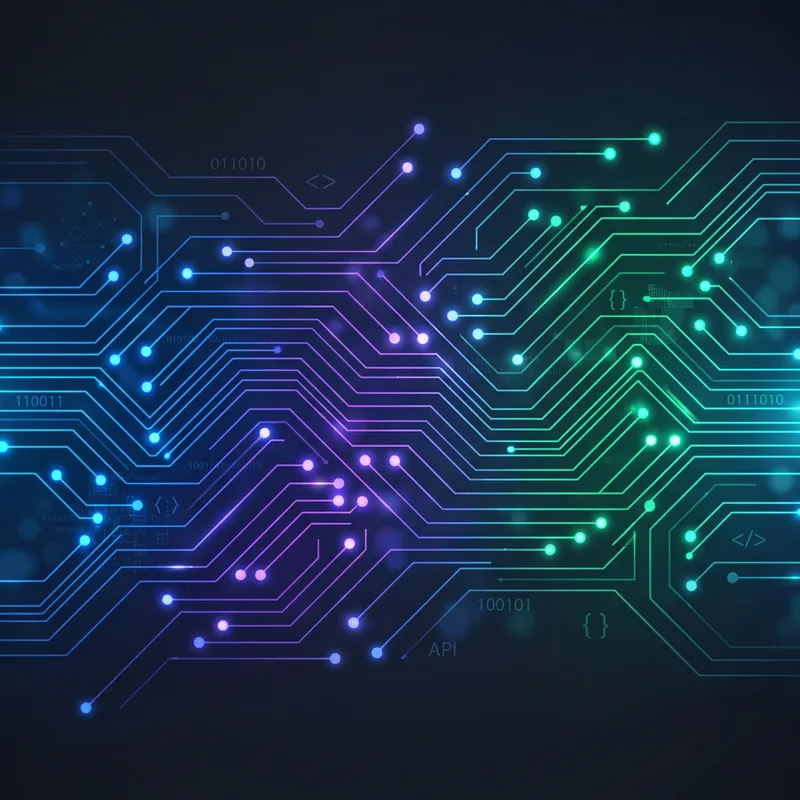 Modern circuit/digital lines with glowing nodes in blue/purple/green tones. Clean, professional, and screams 'tech/web developer' without being overwhelming.