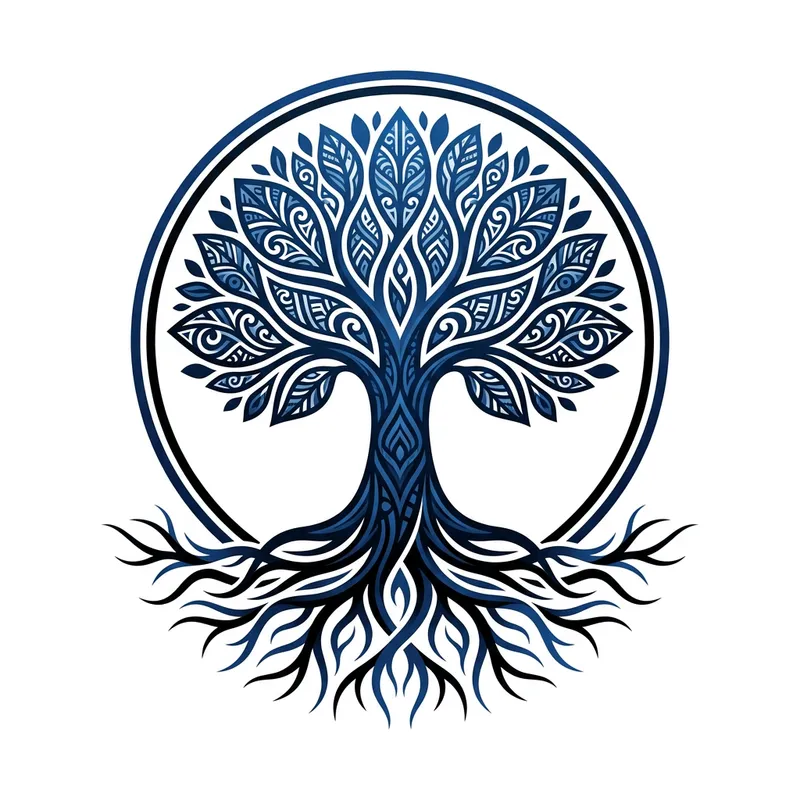 Design a unique logo. It should have no more than three colors - blue, white, and black. The logo should be circular in shape with a stylized, abstract version of a tree in the center. The tree should have intricate patterns for leaves, and the roots of the tree should extend out of the circle. The background should be white, and the tree and the circle should be in black and blue. Overall, it should look professional, modern, and eco-friendly.