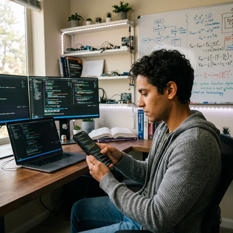 A person, of unspecified gender and descent, is in the process of coding with a generic touch screen smartphone that is top-of-the-line and highly modern. The environment is filled with creativity and technology, perhaps including computer screens, diagrams, and complex lines of code.
