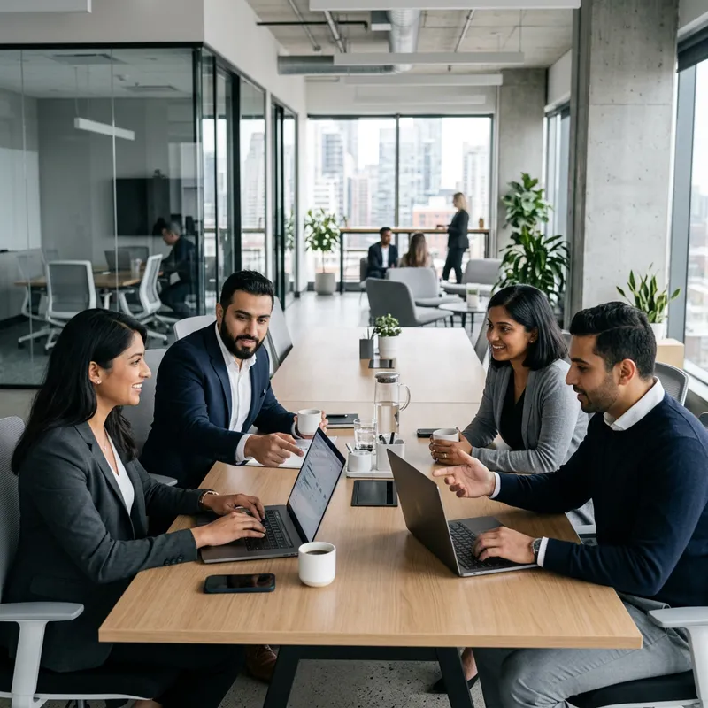 Design an image reflecting a sleek and modern corporate identity. This corporate theme focuses on simplicity and efficiency. It employs a minimalistic color palette, often using monochromatic shades. The image should include elements commonly associated with corporate environments, including an open workspace, modern technology such as sleek laptops and smartphones, and a coffee cup or two. The people in this scene are a mix of South Asian and Middle-Eastern descent, showcasing both genders interacting harmoniously in this corporate setting.