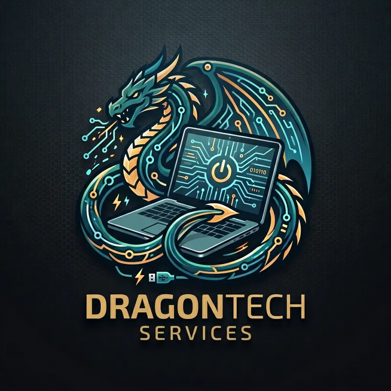 Create a intricate logo integrating a powerful dragon and symbolic elements representative of laptop and other electronics. The dragon is styled in a modern, minimalist manner. It wraps around a laptop image, suggesting a symbiotic relationship between the mythical creature and technology. The overall color scheme employs striking contrasts to emphasize the components of the logo. The backdrop is minimal to allow the objects to stand out, appealing visually to anyone seeking technological services accompanied by the strength and magic symbolized by the dragon.
