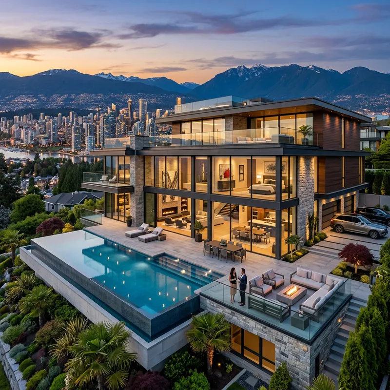 Create an image showcasing an ultra-modern, luxurious house. It should feature cutting-edge architecture, sleek lines, and large glass windows with panoramic views. The house should be situated in a beautiful landscape, perhaps with a stunning viewpoint of mountains or a vibrant cityscape. It should feature lavish amenities, such as a large infinity pool, sprawling gardens or terraces with high-end outdoor furniture, and elaborate interiors styled with the finest and most exclusive decor. The residence should epitomize the pinnacle of affluence and modern design.