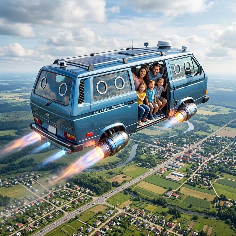 Imagine an absurd, modern twist on a classic minivan. As if taken straight out of a science fiction novel, the vehicle is taking flight instead of its usual role on the road. It soars through the sky as easily as it once navigated potholes. The overall shape remains traditional and familiar: rectangular, stable, and with the typical sliding door. But underneath, shimmering jets replace conventional tires. Its sides are sleek with polished blue paint, reflecting the azure sky above, while small porthole windows offer passengers breathtaking aerial views. Below, the landscape reveals tiny houses and verdant fields, other cars now insignificant toys. This fantasy brings together the peculiar charm of everyday commuting with the dreamy expanse of the open sky.