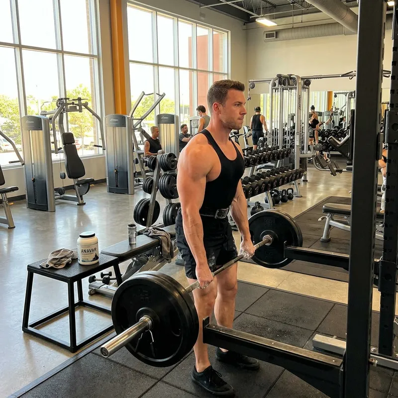 A well-lit gym with an array of modern training equipment, like weight machines, dumbbells, and kettlebells. There's an athletic Caucasian male bodybuilder in the center of the image, preparing to lift a heavy barbell. His muscular physique, especially his well-defined biceps and triceps, reveal his commitment to fitness and bodybuilding. On a nearby table, there's a container labelled 'Anavar', symbolizing its use within the bodybuilding community. It's a day shot, with sunlight streaming through the gym's windows, casting a warm hue on this intense and motivational setting.