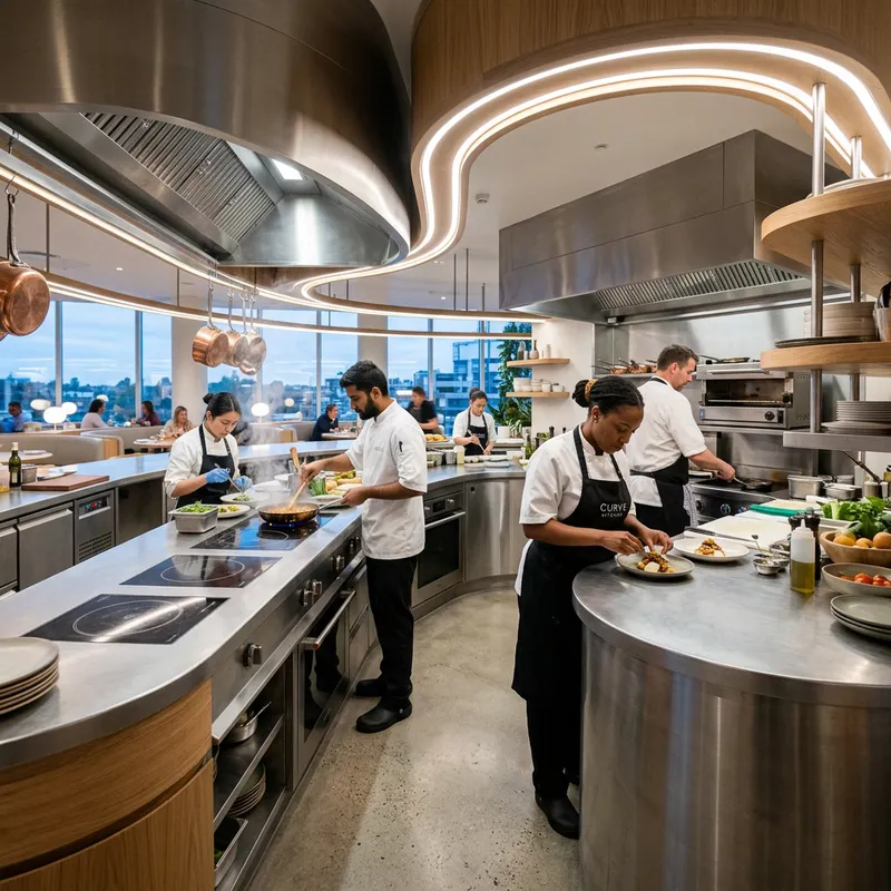 High-resolution digital rendering of a modern kitchen design in a restaurant. The interior design is minimalist and contemporary, featuring sleek and dynamic curved lines. Envision ample open space creating a bright and airy atmosphere. There are chefs of varying genders and descents in action, which contributes to the lively environment.
