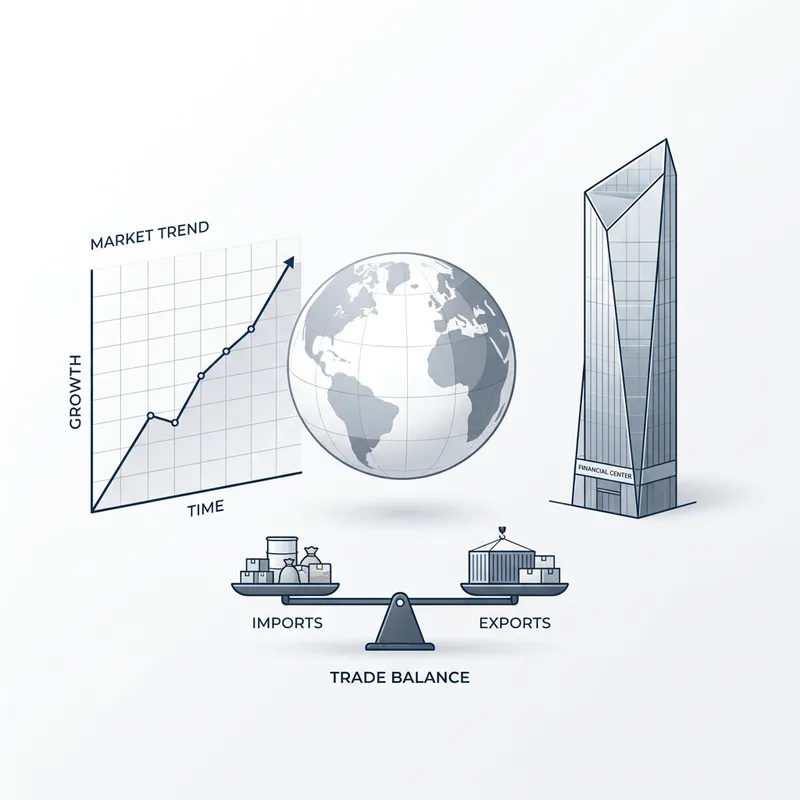 Picture a modern minimalist scene. Visualize a clean, simple stock market graph on a pristine white background. Floating next to it, imagine a spherical globe, showing continents in subtle shades of grey. Also, conceptualize a minimalist skyscraper, stark against the backdrop, symbolizing a financial institution. Finally, include a seesaw showing scales of trade balancing, all composed harmoniously in a modishly minimalist style.