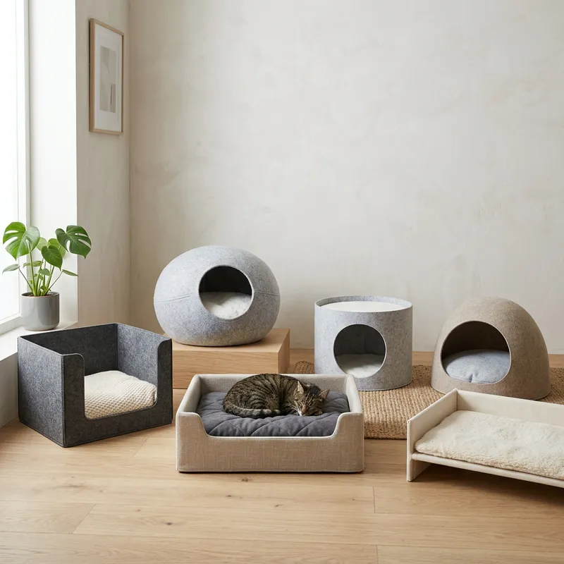 Create a scene with a selection of cat beds. These beds should have a modern, minimalistic design. Show them against a simple background, possibly a white or neutral one to emphasize their minimalistic style. Include a variety of shapes, like cubes, spheres, or rectangles, but maintain a sleek and streamlined look in each design. Use neutral colors such as grays, whites, or beiges to maintain a serene, contemporary aesthetic. Add a few details such as soft cushions or clean lines to highlight their comfort and functionality for cats.