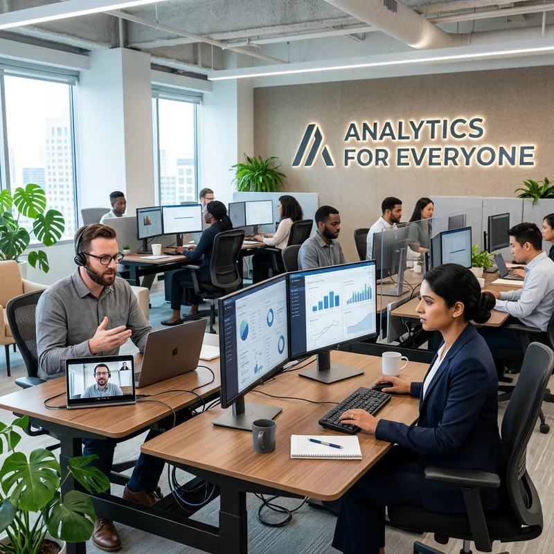 A very modern and organized office with the tagline 'Analytics for Everyone' prominently displayed on one of the walls. There's a blend of contemporary decor and innovative tech equipment. An array of computers set up on sleek desks signify cutting-edge technology. A South Asian woman in formal attire is attentively analyzing data on a dual monitor setup, whilst a Caucasian man is involved in a video call on his laptop, their focused expressions reflecting their dedication to analytics. There's a multi-cultural, gender-balanced team diligently working in their respective cubicles in the background.