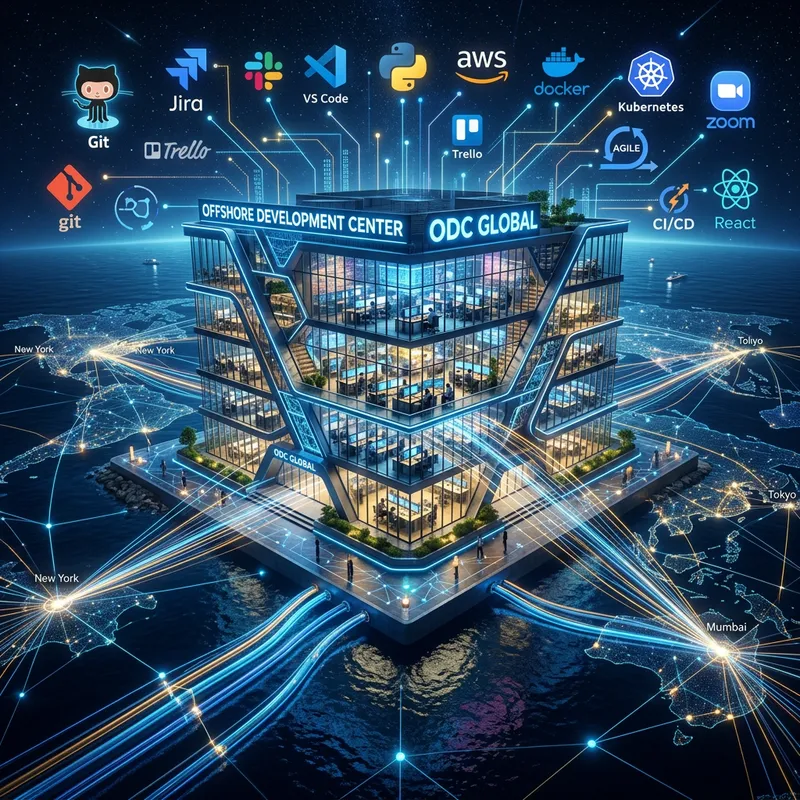 An offshore development center (ODC) situated within a digital landscape. Imagine the ODC as a modern architectural marvel illuminated by the glow of computer screens seen through the large glass windows. Surrounding the ODC, there are numerous network connections illustrated as glowing lines extending towards various parts of the globe. Underwater fiber optic cables stretch deep below the digital sea, symbolizing the ‘offshore’ aspect. The sky is studded with virtual reality objects representing different technology tools used in the ODC for software development and project management.