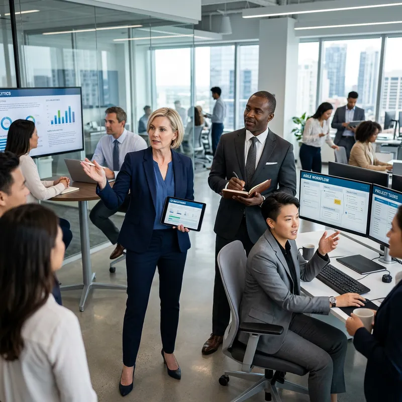 A photo illustrating the modern duties of a senior supervisor showing professionalism and confidence. Visualize a diverse group of three individuals – a Caucasian woman, an African man, and an Asian individual of unspecified gender – each performing their tasks adeptly. The work environment is sleek with state-of-the-art technology, and is bustling with activity. Their clothes indicate their senior roles – formal suits in modern cuts. Each individual exudes confidence, displayed through their comfortable body language and determined facial expressions as they conduct meetings, segment tasks, or make critical decisions.