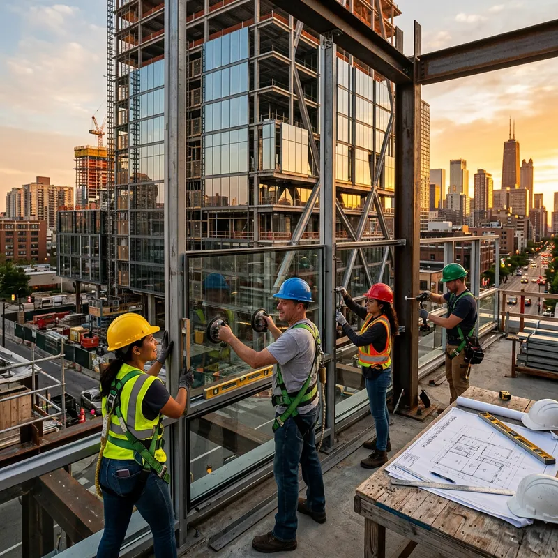 An intricately detailed image of a construction process dubbed 'simple skin building'. The building has sleek, modern design cues, with an emphasis on large glass panels interlaced with strong steel framework to form the 'skin'. Skilled builders, a diverse team consisting of Caucasian and Hispanic men and women, hold various tools, communicating and working together in harmony. Architectural blueprints lay open on a table nearby, showing the plan for the minimalist design. The scene is set against a backdrop of an urban skyline, with the sun setting and casting a golden glow over the scene.