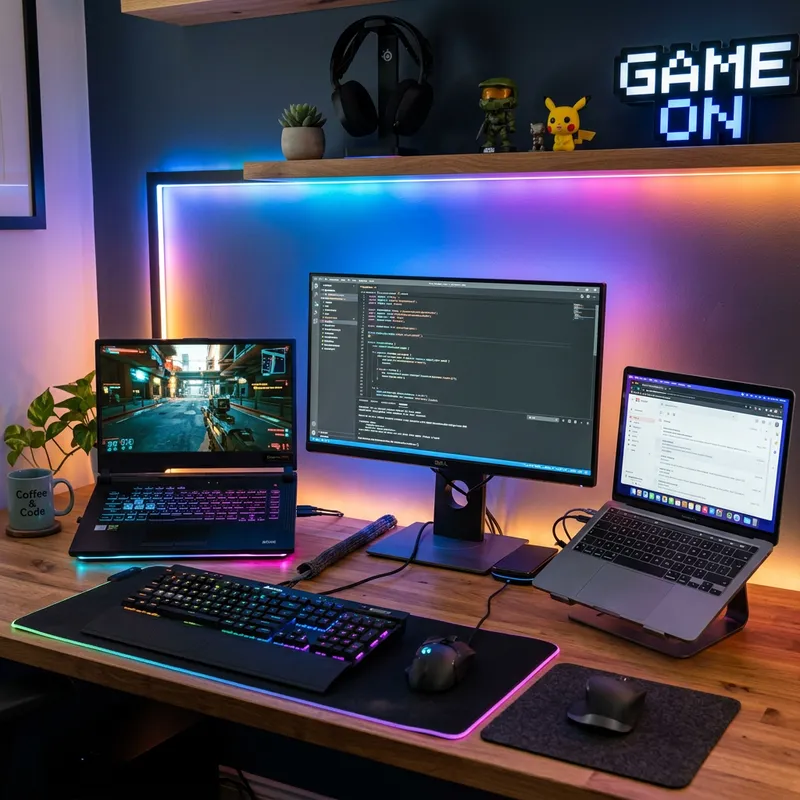 Modern Tech Setup with Dual Laptops and Gaming Keyboard
