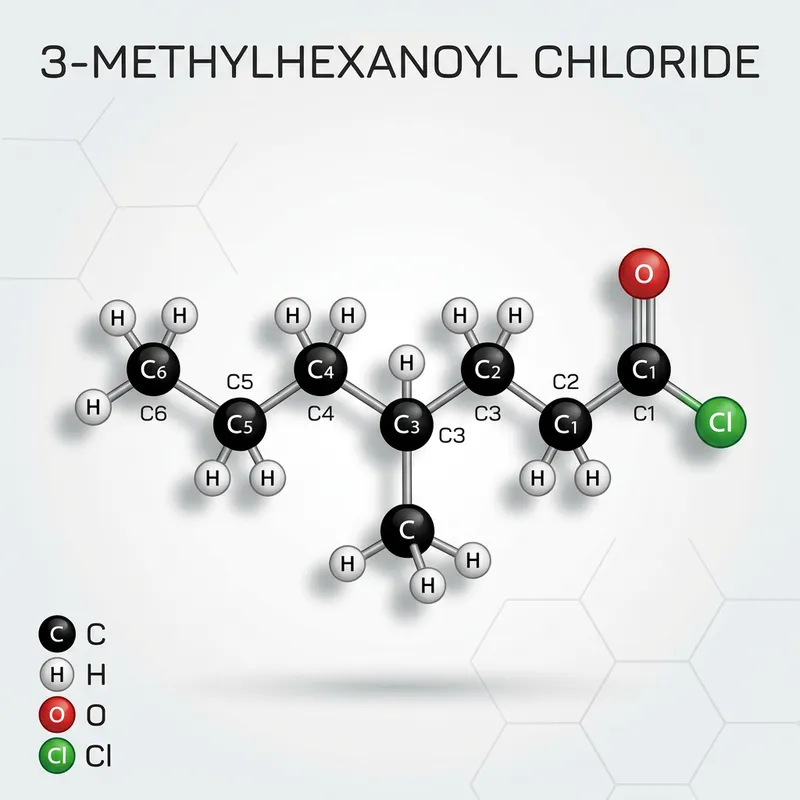 A detailed illustration of the molecular structure of the organic compound known as 3-methylhexanoyl chloride. The atoms should be color-coded based on their type: carbon atoms in black, hydrogen atoms in white, oxygen atoms in red, and chlorine atoms in green. The atoms should be represented as spheres, with the bonds between them depicted as sticks. Ensure the layout accurately mirrors the structure of this compound, highlighting the key functional groups.
